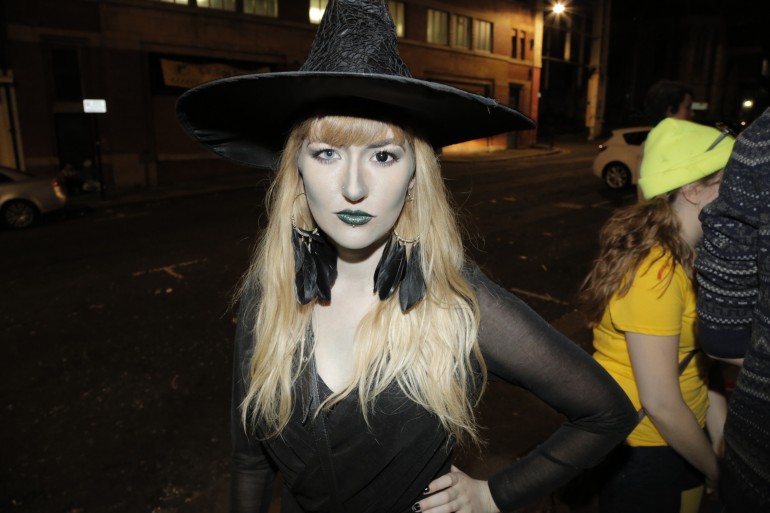 Rocking the one contact, her make up seems meticulously applied, paying attention to neck & hands whilst looking pretty spooky… May we be so bold as to suggest that every second earring feather should have been purple..?