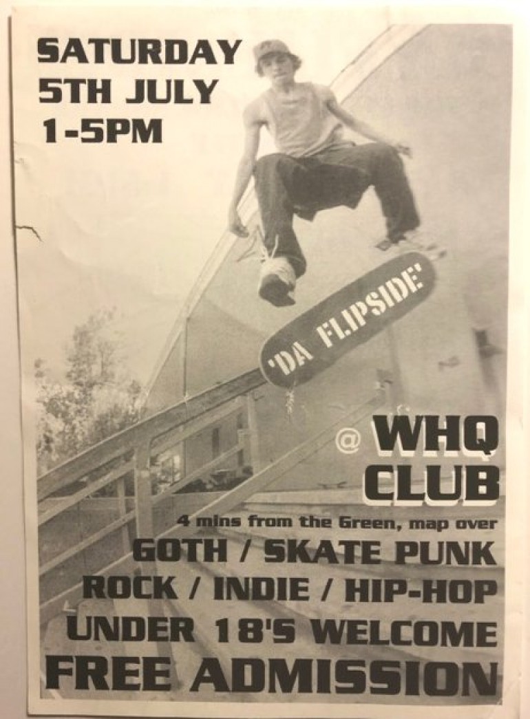 He wanted to hire WHQ Club & for us to put a Rock / Goth / Skate-Punk Club show on Saturday afternoons. The idea was that plod would pay for it, WHQ would facilitate it & it would be free to get in. Then all the kids would hopefully be led by the music, come to the Club on Saturday afternoons & vacate the Hippy green, thus solving their problem.