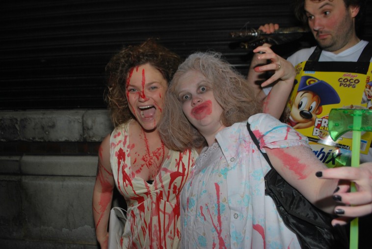 Prom queen 5 here on the left, has got the blood thing properly organised & is to be commended. Looks like Cereal Killer in the background is about to crock her some more..? Zombie Granny is hitting a cool pose here too alongside her & the little green hatchet is a cute touch.