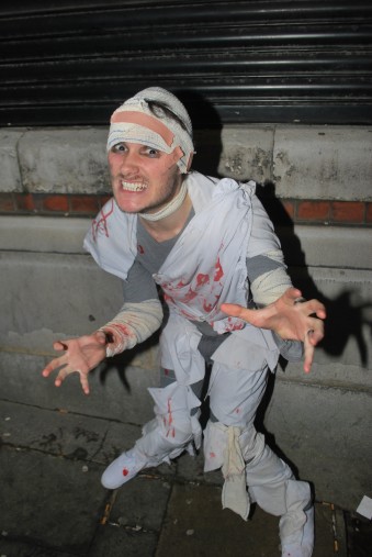 His look is good & it's also a good, if slightly unconventional mummy pose. The blood here could easily have come from another living being so we'll let that go, but again the undergarments we simply cannot forgive.