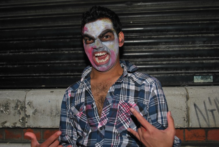 Here we have a chap who has gone to a substantial effort to rock a quite fetching zombie vibe, only to have it overshadowed by what can only be described as a vagina wig, smack in the middle of his chest... Why he even bothered getting made up, when he could simply have rocked that natural 70's style, hairy growler he has on his cleave there, is beyond us. Wolfman costume next year mate, just come butt naked.