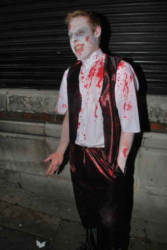 Took us ages to get this geezer to agree to have his photo taken, yet his get up is certainly better than some of the limp-wristed chancers, further up the page. He’s got his faults, terrible hairline/make up border, total lack of inner ear make up & bloodless palms, but despite all that, his shirt is extremely well put together. With a couple of strategically placed shirt tears in there & a spot more makeup, he could stand a chance in future contests. We’d advise him to attend our Zombie posing seminar, which we’ll be holding in the Club a fortnight before Halloween next year.