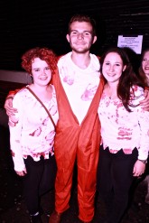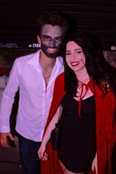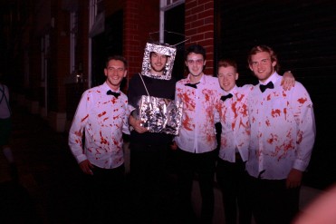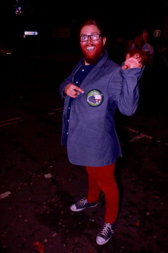Brandishing a red face, pointy vamp gnashers & weirdly, what would appear to be the lid from a pot of humous, clipped onto his blazer as some form of broach..?