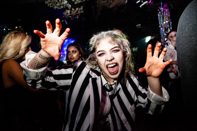 A Halloween staple we're accustomed to seeing year after year & with pretty good reason too, who'd like to bump into that on a dark Autumnal night..? Certainly not us..! Of course, the suit looks like a Magic Box job, as opposed to a true DIY triumph, but she all but makes up for it with the claws, stance & 'dragged through a bush backwards' do... She's even gone to great lengths to smear herself silly with a couple of fresh turds, which is truly in keeping with the spirit of the spook-a-thon...
