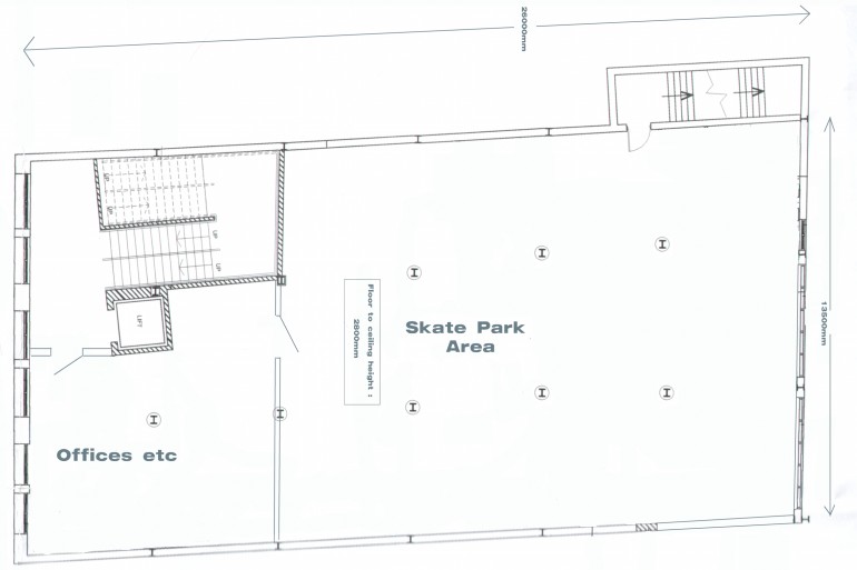 It’s all well & good having a 3000 sq foot room, but add an office & spread 6 roof supporting steel girders around it & the idea of whizzing about on skateboards at 90 miles an hour rapidly becomes a ticket to the RVI. It was too small really, even at that size.